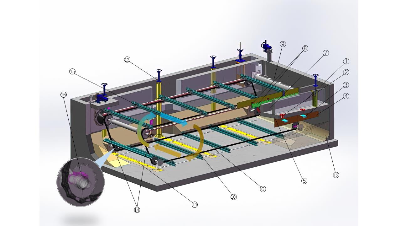 沉淀在池底的污泥由鏈條刮泥機刮入就近的液壓吸泥管中。刮板以0.3m/min或更小速度運行,避免對污泥層造成攪動,保證較低的出水SS。吸泥管上有一系列的吸泥孔,沿池寬方向均勻地、不間斷地吸除沉淀的污泥。